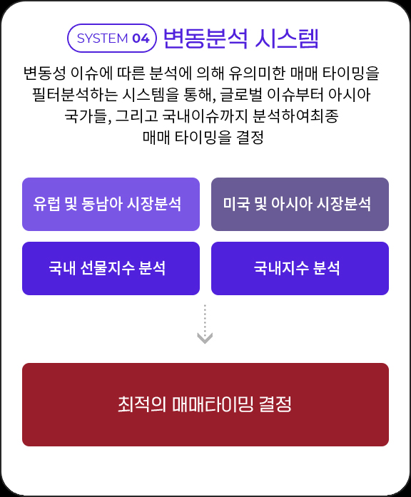 '변동성 이슈에 따른 분석에 의해 유의미한 매매 타이망을 필터분석하는 시스템을 통해 글로벌 이슈부터 아시아 국가들 그리고 국내이슈까지 분석하여 최종 매매 타이밍 결정'